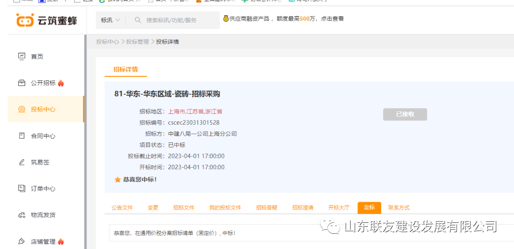 近日我公司在中建八局一公司上海分公司华东区域瓷砖招标采购项目中,凭借过硬的产品质量,扎实高效的工作作风,卓越的运作团队,优异的项目方案和良好的企业信誉,以绝对优势顺利中标。