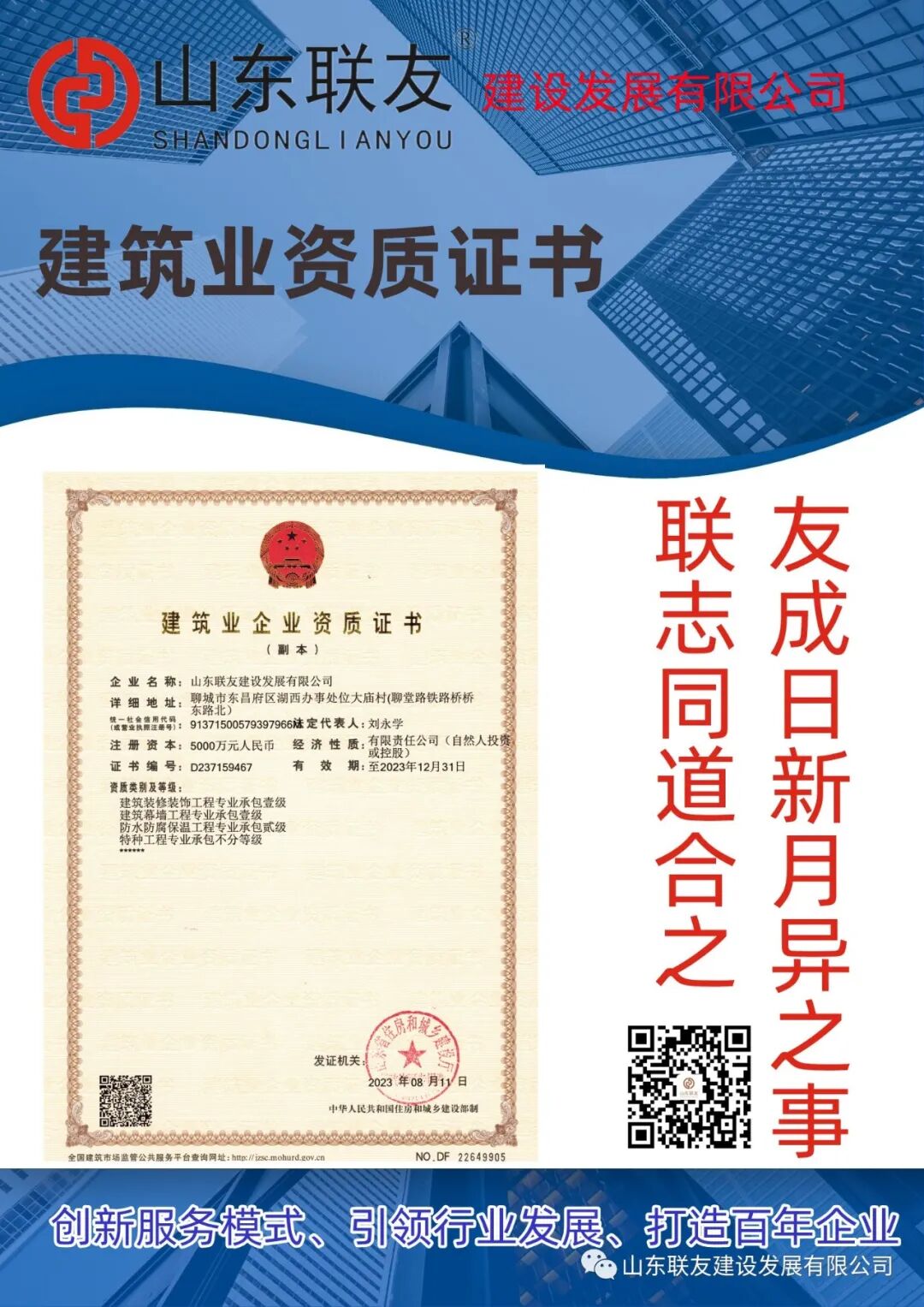 山东联友建设发展有限公司建筑业资质证书